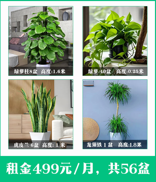 499元/月,一共56盆绿植,租期最短1年。本套餐非常贴心,适合新新开的公司,56盆足够500左右的办公室除甲醛,净化空气。其中网红龙须铁1盆,网红绿萝柱8盆,